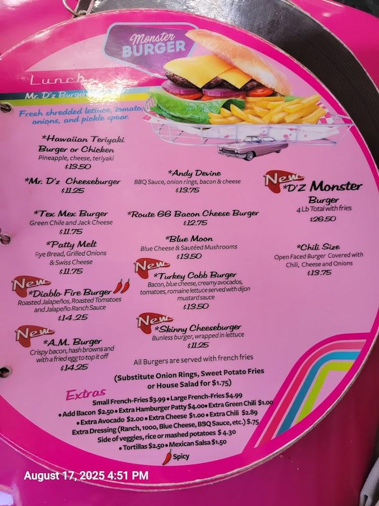 Experience a slice of Americana at Mr D'z Route 66 Diner, a beloved family-owned eatery in Kingman, AZ. Founded by the Dunton family, the diner is famed for its uniquely crafted root beer, inspired by childhood memories and perfected through family taste tests. Enjoy delicious American cuisine with a focus on breakfast and savory diner classics, all served in a vibrant retro setting. With amenities like a cozy terrace, quick service, and accessible options, Mr D'z is perfect for solo diners and families alike. Stop by for excellent coffee, mouth-watering desserts, and a taste of local specialties!